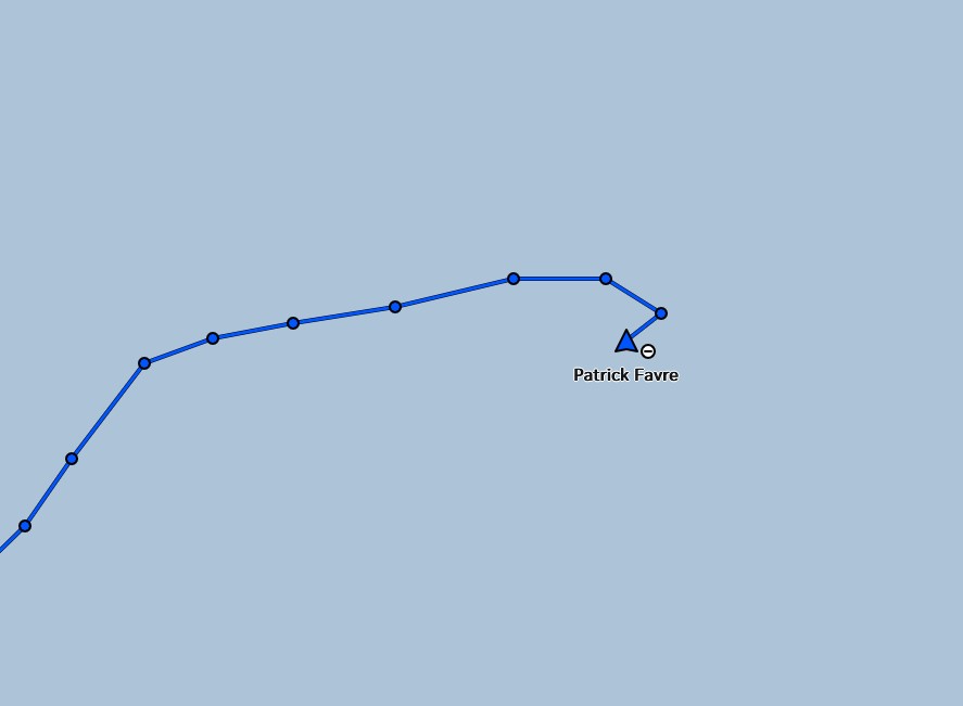 Malgré toutes ces péripéties, Patrick continue à progresser vers l’est. Il va dépasser le seuil des 70% du parcours si l’on se fixe toujours une arrivée à Brest. Il a même été flashé à une vitesse de 17,6 nœuds aujourd’hui à 13h sur un surf ! Le retour au calme n’est pas aussi rapide !