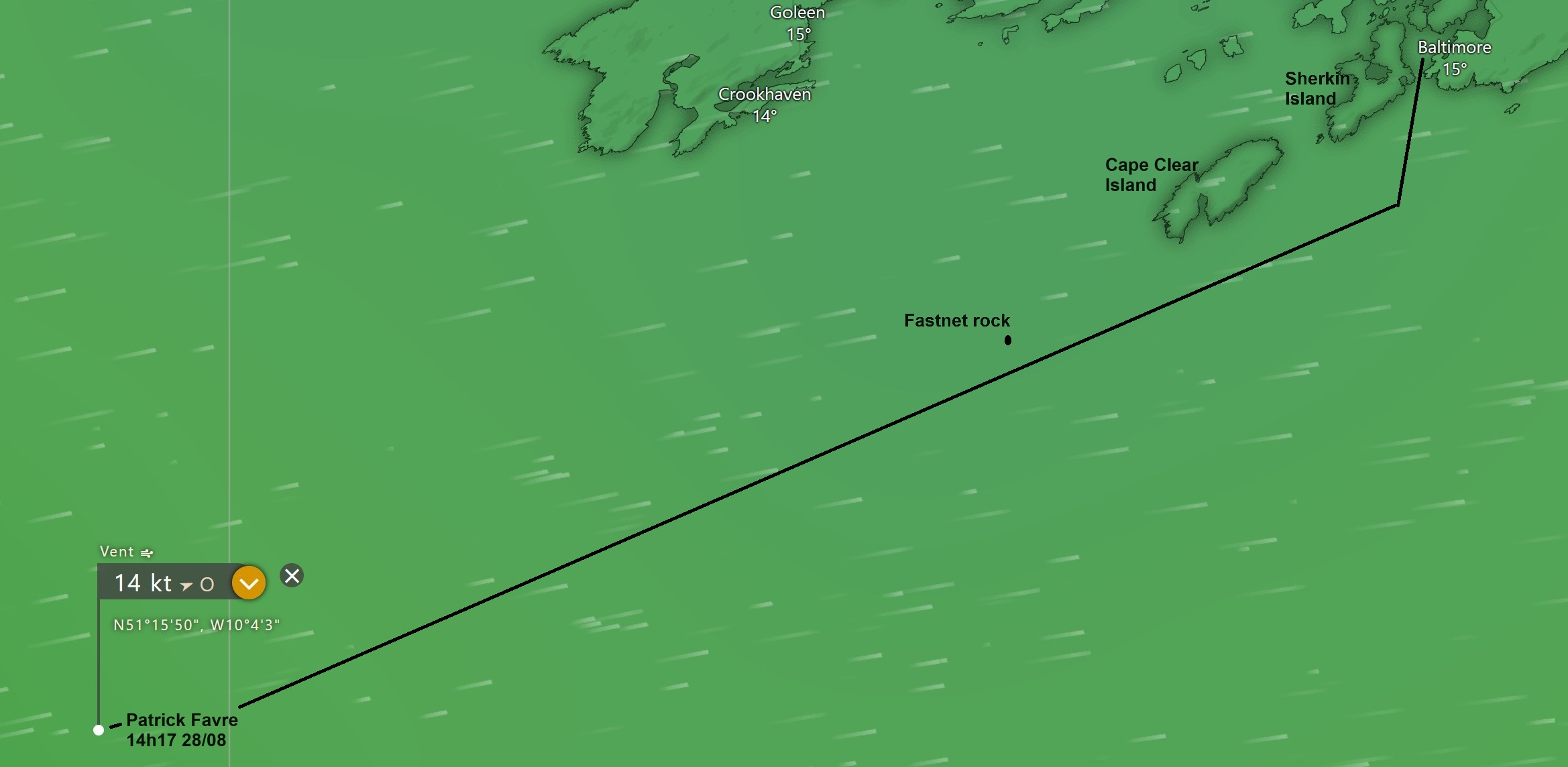 Le port de Baltimore est en ligne de mire. Il reste en ce milieu de journée une trentaine de miles à parcourir (environ 65km) en mer Celtique nom donné à la partie de l’océan Atlantique qui borde les côtes sud de l’Irlande, les pointes sud-ouest de la Grande Bretagne et la façade ouest de la Bretagne. Sur son trajet jusqu’au port, Patrick apercevra à bâbord Fastnet Rock (« île aux pierres tranchantes »), îlot rocheux qui s'élève à environ 30 mètres au-dessus de la laisse des basses eaux. Fastnet est connu sous le nom de « larme de l'Irlande », car c'était la dernière partie de l'Irlande que certains émigrants irlandais du XIXe siècle ont vue alors qu'ils naviguaient vers l'Amérique du Nord. Pour Patrick ce sera la première terre européenne qu’il verra. Sur ce rocher est érigé un phare matérialisant le point le plus au sud de l’Irlande.